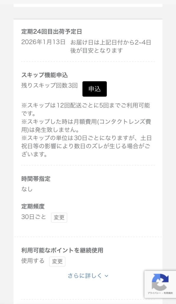 私は基本的には仕事や、出かけるときしかコンタクトをしないため毎月使いきれません。しかし毎月送られてくるため、放っておくと、どんどんコンタクトが貯まってしまうのですが、diconは年に5回のスキップ機能を認めており、今の枚数なら今月は送ってもらわなくても足りそうだなと思ったときはスキップ機能を使えば良いのです。毎日使う人じゃない場合、この機能ありがたいですよね。